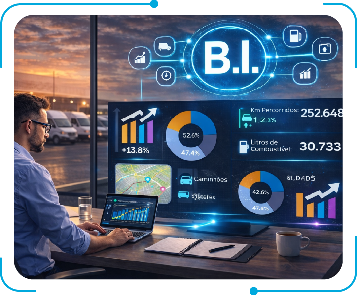 A integração com Power BI permite que você visualize os indicadores mais relevantes da sua frota em tempo real. Crie dashboards personalizados, monitore desempenho e tome decisões com base em dados confiáveis.
