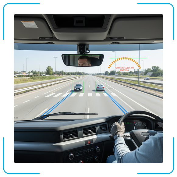 A câmera frontal equipada com tecnologia ADAS identifica obstáculos, pedestres e veículos à frente, promovendo direção segura e preventiva. Com alertas inteligentes, ela auxilia o motorista a manter distância adequada e agir com antecedência, reduzindo riscos de colisões e aumentando a eficiência da condução em qualquer tipo de operação.